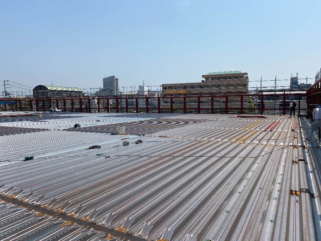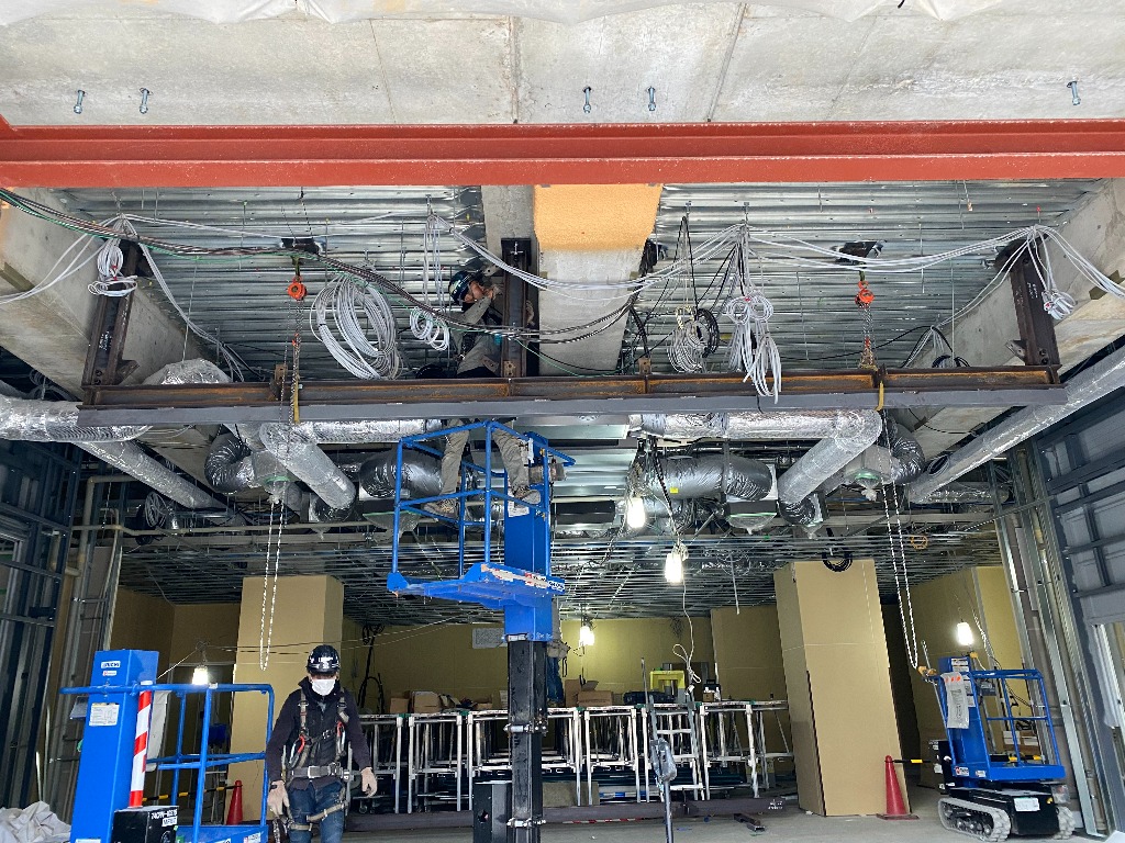 タワークレーンという伸縮ができるクレーンを用い、高いところまで作業が可能です。