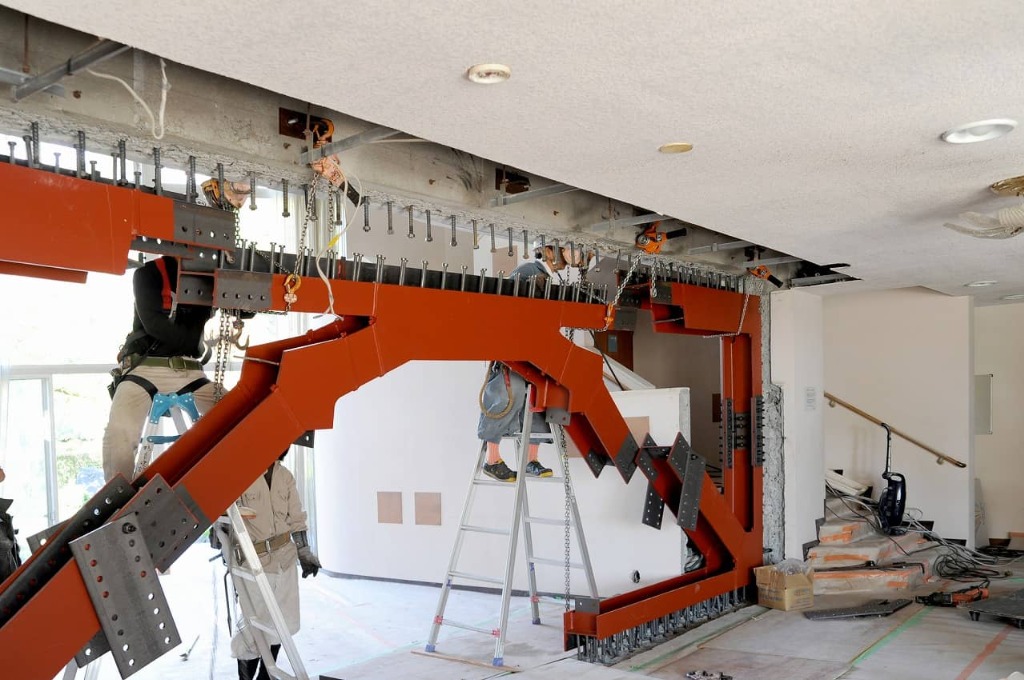 フロアクライミング方式は、クレーンを支える支柱が短く、フロアが完成するとその支柱ごとクレーンをどんどん上の階に上げていく方式です。